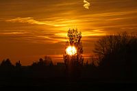 Zonsondergang achter bomen. Sfeer van de avond. Landschap in Duitsland