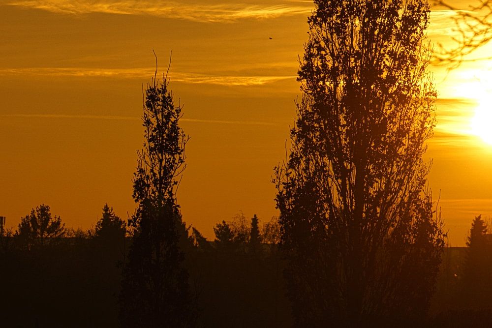 Zonsondergang achter bomen. Sfeer van de avond. Landschap in Duitsland