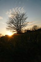 Zonsondergang achter bomen. Sfeer van de avond. Landschap in Duitsland