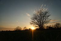 Zonsondergang achter bomen. Sfeer van de avond. Landschap in Duitsland