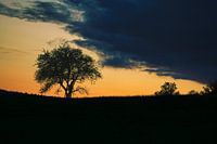Zonsondergang achter bomen. Sfeer van de avond. Landschap van Duitsland