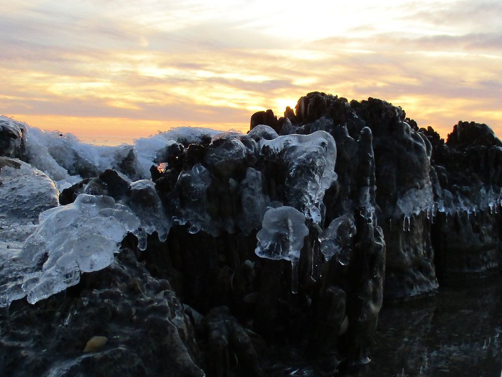 Zonsondergang met ijzige pier aan het strand. Met de weerspiegeling van de wolken in het water kwam de pier mooi uit.