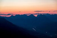 Zonsondergang in het Inntal te Oostenrijk. Genomen van de top van de Nockspitze, een berg die een mooi uitzicht geeft over de gehele regio. Je kan in de diepte de rivier door het dal zien lopen.