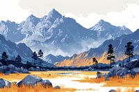 Deze kunstzinnige afbeelding toont een verbluffende combinatie van sereniteit en ruwe natuurlijke schoonheid, perfect voor het verlevendigen van elke ruimte. De afbeelding kenmerkt zich door rustige bergtoppen en een vredig meer, allemaal onder een betoverende zonsondergang. De kleuren lopen vloeiend in elkaar over van zachte blauwtinten tot warme zonnestralen, wat een gevoel van rust en ontspanning creëert. Ideaal voor wie een element van natuurlijke elegantie in zijn interieur wil brengen, deze print past goed in zowel moderne als traditionele instellingen.