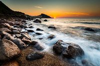 Zonsondergang bij de baai van Caselsardo in het noordelijk deel van Sardinië, het eiland van Italië in de Middellandse Zee.