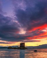 Een verticale 4:5 foto van een zonsondergang bij Castle Stalker, een torenhuis met vier verdiepingen en schilderachtig gelegen op een getijden eilandje aan Loch Laich, een inham van Loch Linnhe, Schotland.