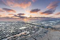Landschap van een mooie zonsondergang van de Waddenzee bij Harlingen. Op de voorgrond de mooie structuren van de kleine poeltjes en het zand.