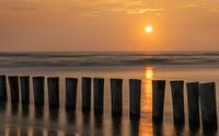 Een golfbreker aan de westkust van het Nederlandse eiland Ameland bij het strand van Hollum. De foto is bij hoog water gemaakt bij zonsondergang, met lange sluitertijd.