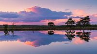 Zonsondergang in Nationaal Park Dwingelderveld, het grootste natte heidegebied van West-Europa. Gelegen in de Nederlandse provincie Drenthe, in de driehoek Dwingeloo, Ruinen en Beilen. Natte laagtes en hoge zandruggen wisselen elkaar af in het uitgestrekte Dwingelderveld. Je vindt er heide, bos, jeneverbesbosjes, stuifzand en ruim veertig vennen. Een deel van die vennen is ontstaan in de ijstijd, andere zijn het resultaat van veenafgravingen.
