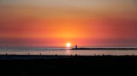De zon zinkt in de zee bij IJmuiden en straalt het laatste warme zomerlicht over de monding van de haven en de vissers die daar actief zijn. Links in de verte zijn windmolens zichtbaar.