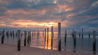 Zonsondergang bij Palendorp in Petten. Op het strand van Petten staat het monument Palendorp. Dit prachtige kunstwerk bestaat uit 160 palen van zes tot twaalf meter lang. De palen hebben de vorm van tien huizen en een kerk. Het herinnert aan het oude Petten, dat lang geleden door de zee werd overspoeld.