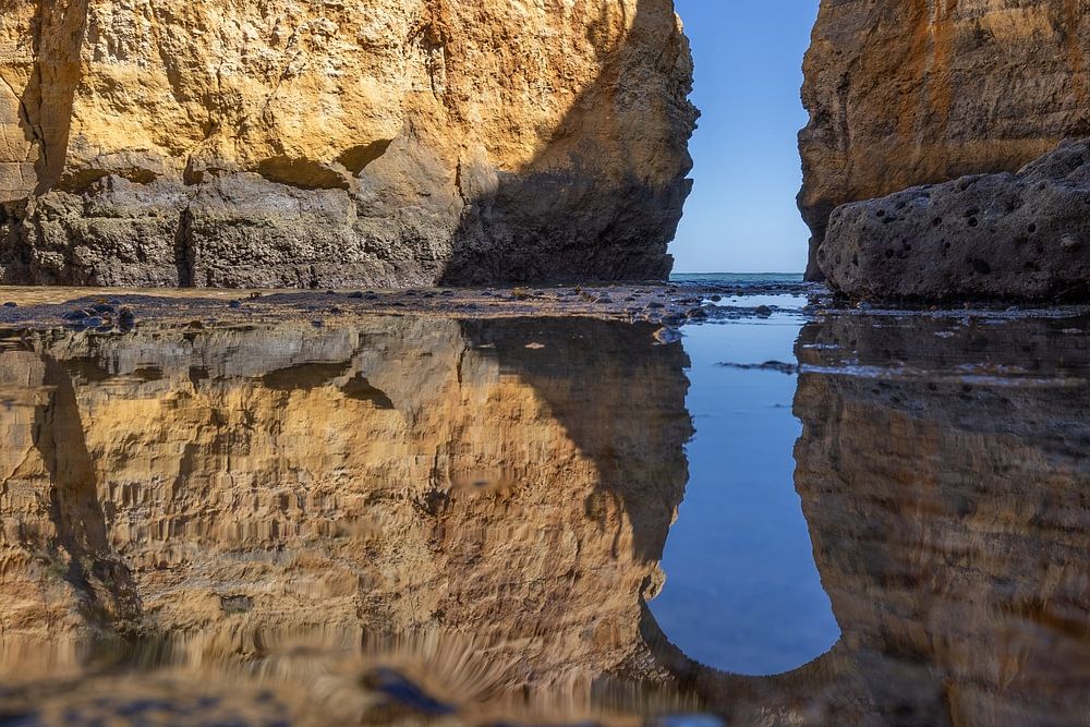 De baai en het strand Praia da Caldeira zijn werkelijk uniek. Een historische stenen brug verbindt twee rotsen waaronder de Atlantische Oceaan en het zandstrand samenkomen. Lagos, Algarve, Portugal