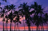 Palmbomen wuiven in de wind tijdens een kleurrijke en romantische zonsondergang in Pu'uhonua o Hōnaunau, een nationaal historisch park met uitzicht over de grote oceaan gezien vanaf The Big Island, op Hawaii, Verenigde Staten.