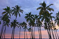 Palmbomen wuiven in de wind tijdens een kleurrijke en romantische zonsondergang in Pu'uhonua o Hōnaunau, een nationaal historisch park met uitzicht over de grote oceaan gezien vanaf The Big Island, op Hawaii, Verenigde Staten.