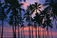 Palmbomen wuiven in de wind tijdens een kleurrijke en romantische zonsondergang in Pu'uhonua o Hōnaunau, een nationaal historisch park met uitzicht over de grote oceaan gezien vanaf The Big Island, op Hawaii, Verenigde Staten.