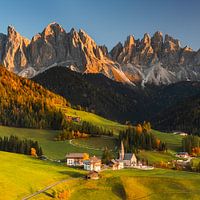 Een vierkante foto van een zonsondergang met herfstkleuren van misschien wel een van de meest beroemde landschappen in de Dolomieten, de kerk en het dorp Santa Maddalena voor de Geisler of Odle Dolomieten bergtoppen in Val di Funes, in de Italiaanse provincie Zuid-Tirol in het Dolomietengebergte.