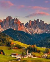 Een verticale 4:5 foto van een zonsondergang met herfstkleuren van misschien wel een van de meest beroemde landschappen in de Dolomieten, het kerkje en het dorp Santa Maddalena voor de Geisler / Odle bergtoppen in Val di Funes, in de Italiaanse provincie Zuid-Tirol in het Dolomietengebergte van noord-Italië.