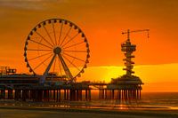 Zonsondergang bij Scheveningse Pier, Noordzeekust, Nederland ; bungy jump, reuzenrad SkyView; Giant Wheel. Mooie rood-oranje zonsondergang