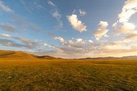 Zonsondergang op de velden van het Song Kul plateau in centraal Kirgizië met wolken . Geel licht valt op het gras en geeft het een gouden schijn