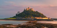Een horizontale 2:1 foto met avondlicht en Eb bij St Michael's Mount, een klein getijdeneiland in Mount's Bay, in Cornwall, aan de zuidwestkust van Engeland.