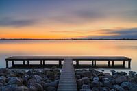 Een schilderachtige zonsondergang bij een steiger aan het Schildmeer, een meer gelegen in de streek Duurswold in de Nederlandse provincie Groningen tussen Schildwolde en Overschild. Door het meer stroomt het Afwateringskanaal van Duurswold.