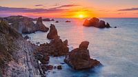 Een 16:9 foto van een zonsondergang bij de rotsformaties Los Urros de Liencres, onderdeel van een prachtig geologisch natuurpark in Cantabrië nabij de stad Liencres in het noordwesten van Spanje.
