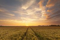 De zon gaat onder boven een graanveld in Westeremden in de provincie Groningen.