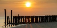Zonsondergang bij Zoutelande Zeeland, de zon boven de paalhoofden en de lucht kleurt fraai oranje.