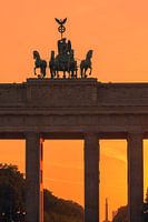 Zonsondergang bij de Brandenburger Tor, een 18e-eeuws neoklassiek monument in Berlijn, Duitsland. Bovenop de poort staat een Quadriga, een strijdwagen getrokken door vier paarden, aangedreven door Victoria, de Romeinse godin van de overwinning.