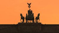 Zonsondergang bij de Brandenburger Tor, een 18e-eeuws neoklassiek monument in Berlijn, Duitsland. Bovenop de poort staat een Quadriga, een strijdwagen getrokken door vier paarden, aangedreven door Victoria, de Romeinse godin van de overwinning.