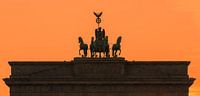 Zonsondergang bij de Brandenburger Tor, een 18e-eeuws neoklassiek monument in Berlijn, Duitsland. Bovenop de poort staat een Quadriga, een strijdwagen getrokken door vier paarden, aangedreven door Victoria, de Romeinse godin van de overwinning.