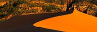 Een panoramafoto van de Coral Pink Sand Dunes, een State Park gelegen tussen Mount Carmel Junction en Kanab in het zuidwesten van de Amerikaanse staat Utah. Het park heeft zandduinen gelegen naast rode zandstenen rotsen.