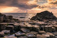 Zonsondergang bij de "The Giant's Causeway", een gebied van ongeveer 40.000 in elkaar grijpende basaltkolommen, het resultaat van een oude vulkaanuitbarsting. Het ligt in County Antrim aan de noordkust van Noord-Ierland.