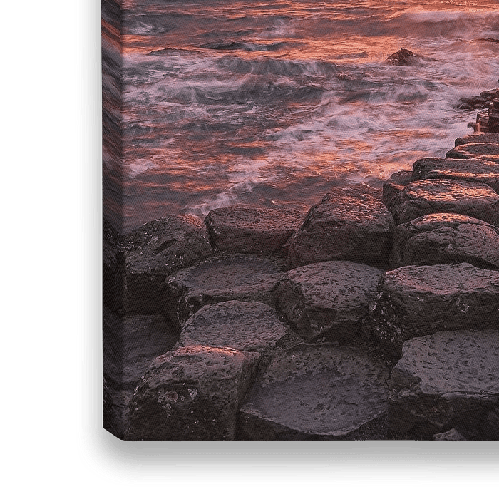 Een vierkante 1:1 foto van een zonsondergang bij de "The Giant's Causeway", een gebied van ongeveer 40.000 in elkaar grijpende basaltkolommen, het resultaat van een oude vulkaanuitbarsting. Het ligt in County Antrim aan de noordkust van Noord-Ierland.