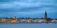 Zutphen skyline aan de IJssel met hoge waterstand na hevige regenval stroomopwaarts in december 2023. Avondfoto met lange belichting waardoor de rivier een glad oppervlak heeft.