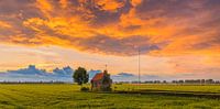 Een 2:1 foto van een zonsondergang bij het monument "Onze Lieve Vrouw van de Bloeiende Betuwe’" in Bemmel (gemeente Lingewaard), een uit bakstenen opgetrokken Mariakapel.