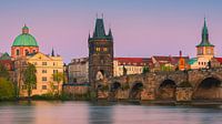 Een horizontale 16:9 foto van een zonsondergang in Praag met uitzicht over de Moldau rivier en de Karelsbrug richting het oude stadsgedeelte van Praag, de hoofdstad van Tsjechië.