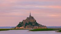 Een 16:9 foto van een avond tijdens zonsondergang bij de beroemde Mont Saint-Michel, staand aan de westkust van Frankrijk in Normandië.