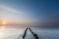 Het is eb bij de Punt van Reide (Groningen). De zon zakt over het wad en geeft het drooggevallen wad een prachtige kleur.