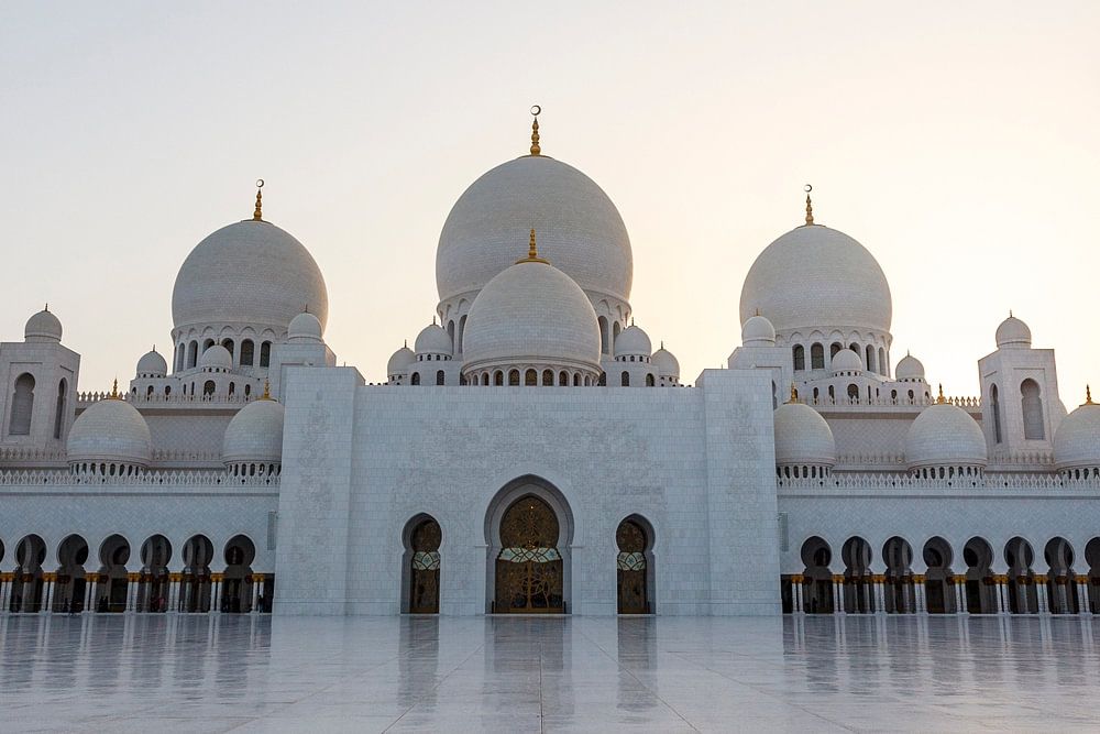 Zonsondergang bij de Sheikh Zayed Grand Moskee in Abu Dhabi, United Arab Emirates