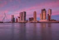 De zon gaat onder bij de Wilhelminapier in Rotterdam met een oorlogschip op de voorgrond.