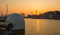 Zonsondergang bij de haven in Volendam. Op de voorgrond een havenpaal die de Volenamse haven zo karakteristiek maakt.