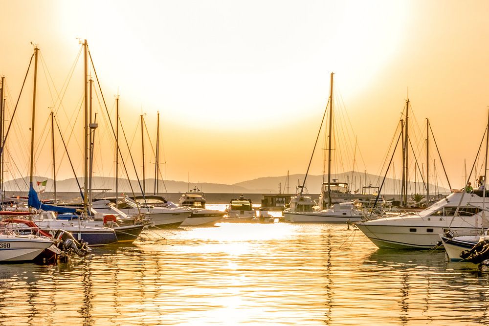 Op een warme middag in Sardinie gaat de zon onder en verlicht de jachthaven in een warme geelachtige kleur.