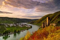 Bij de kasteelruïne bij zonsondergang. Zowel de Moezellus als de wijngaarden zijn in beeld.