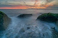 prachtige zeelandschap foto van een zonsondergang geschoten op een mooie zomerse avond bij de pier in IJmuiden. De foto heeft een mooi view op de rotsblokken en de zacht zilkachtige water gevormd door de langesluitertijd en de lichtbakens van de zuid pier en de noord pier. De mooie sluierbewolking maakt de foto af.
