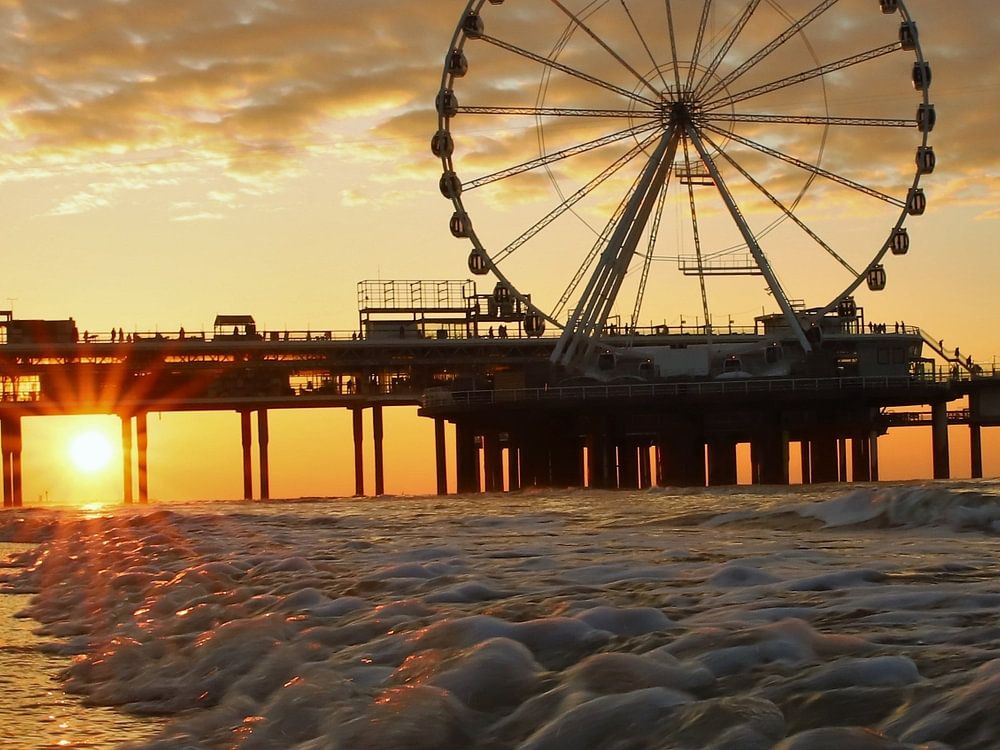 Golven terwijl de zon prachtig onderging bij de pier van Scheveningen, een uniek moment om een plaat te schieten.