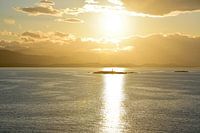 Geweldige zonsondergang boven de vuurtoren van Faro les Éclaireurs tijdens het zeilen door het Beaglekanaal op de Norwegian Star in Argentinië. Het was geweldig om te zien hoe de zon's reflectie in het water de vuurtoren accentueerde.