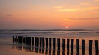 Een golfbreker aan de westkust van het Nederlandse eiland Ameland bij het strand van Hollum. De foto is bij hoog water gemaakt bij zonsondergang, met lange sluitertijd.