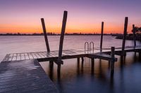 Zonsondergang bij een steiger aan de Westeinderplassen, Aalsmeer in de buurt van Amsterdam, Nederland.