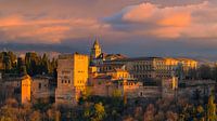 Een zonsondergang bij het Alhambra, een paleis gelegen in de stad Granada, in de regio Andalusië in het zuiden van Spanje. Het Alhambra is een van de beroemdste monumenten van de islamitische architectuur en een van de best bewaarde paleizen van de historische islamitische wereld, naast opmerkelijke voorbeelden van Spaanse renaissance-architectuur. Foto is gemaakt vanaf het beroemde uittzicht van Mirador de San Nicolas.